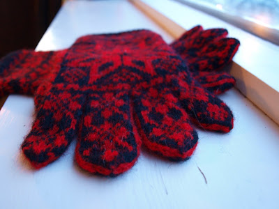 This is what is on the needles at the moment. It is Selbu gloves for my son. It is knitted with Snældan and he choose the colors :-)***************